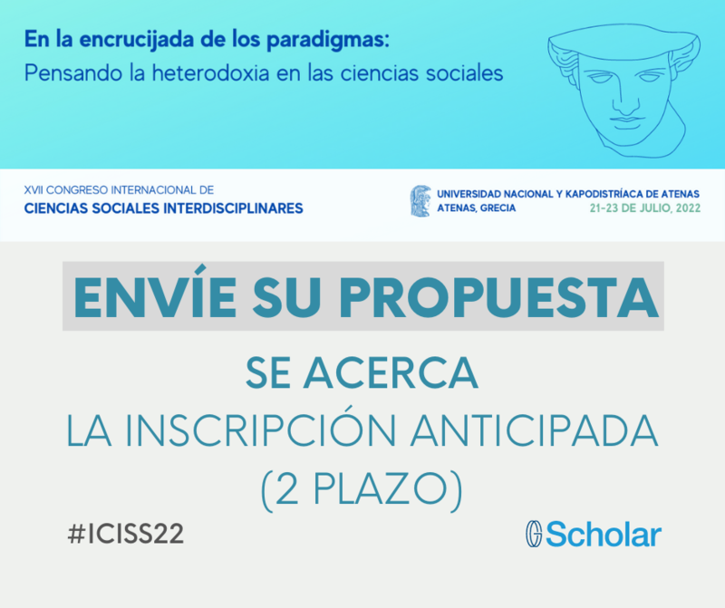 Para poder exponer su trabajo en el próximo XVII Congreso Internacional de Ciencias Sociales Interdisciplinares (21-23 de julio de 2022, Universidad Nacional y Kapodistríaca de Atenas, Grecia), primero, debe tener su propuesta de trabajo aceptada y, después, debe completar su inscripción en el Congreso pagando una de las cuotas de inscripción disponibles. Está a tiempo para aprovechar la cuota anticipada (2º plazo) que vence el 21 de enero de 2022