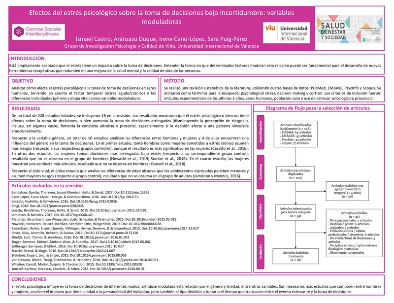 Está ampliamente aceptado que el estrés psicológico impacta sobre la toma de decisiones. Entender los factores moduladores de esta relación puede ser fundamental para el desarrollo de herramientas terapéuticas que mejoren la salud mental y la calidad de vida de las personas. En el presente estudio se realizó una revisión sistemática de dieciocho estudios con el objetivo de analizar cómo afecta el estrés psicológico a la toma de decisiones (TD) en seres humanos, teniendo en cuenta el factor temporal (estrés agudo/crónico) y las diferencias individuales (género y etapa vital) como variables moduladoras. Los resultados mostraron que el estrés psicológico o bien no tiene efectos sobre la TD, o bien aumenta la TD arriesgada o incluso fomenta la conducta prosocial. En relación con el género, las mujeres parecen tomar decisiones más arriesgadas en situaciones de estrés psicológico en tres estudios y en el cuarto estudio que analiza la influencia del género, las mujeres estresadas manifiestan una conducta más altruista. Respecto al ciclo vital, el único estudio que analiza las diferencias de edad observa que los adolescentes bajo estrés perciben menos y asumen más riesgos. Por tanto, el estrés psicológico influye en la TD, modulando esta relación el género y la edad, entre otras variables. Así, son necesarios más estudios que comparen entre hombres y mujeres, analicen el impacto que tiene la edad o la personalidad del individuo, pero también el tipo decisión a tomar o el tiempo que transcurre entre el estresor y la TD.