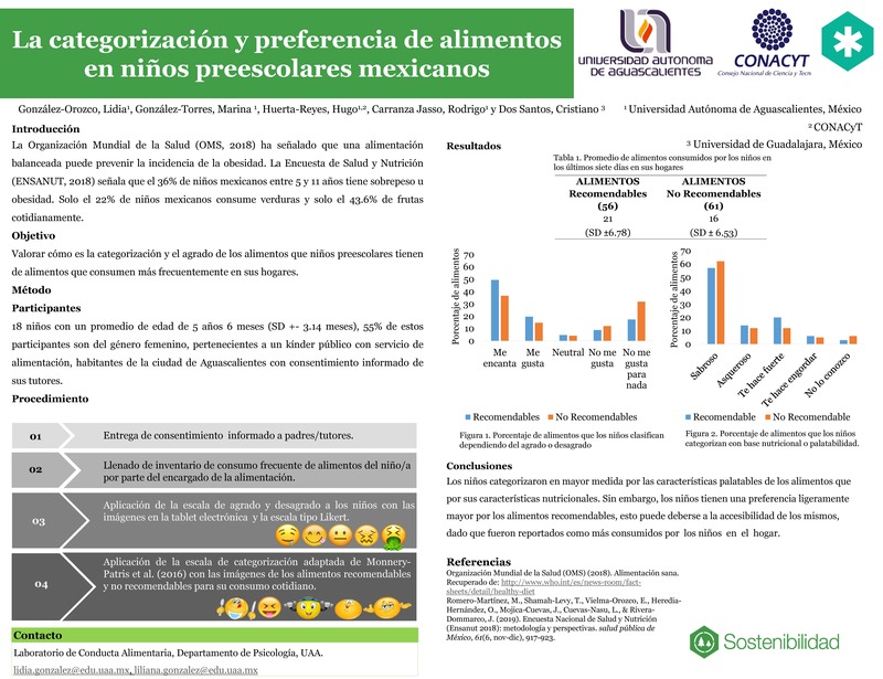 La Organización Mundial de la Salud (2018) ha señalado que una alimentación balanceada puede prevenir la incidencia de la obesidad. La Encuesta de Salud y Nutrición (ENSANUT, 2016) señala que el 33% de niños mexicanos entre 5 y 11 años tiene sobrepeso u obesidad. El objetivo es valorar cómo es la categorización y el agrado de los alimentos que niños preescolares tienen de alimentos que consumen más frecuente en sus hogares. Los participantes son 31 niños de edad promedio de 5 años, 7 meses (±3.14). Una vez que se obtuvieron los alimentos más frecuentes con el inventario de alimentos se presentó a los niños imágenes de dichos alimentos (70 ítems) y se les pidió que indicarán a través de una escala tipo Likert de 5 niveles, el nivel de agrado o desagrado de cada uno. Al final clasificaron los ítems a través de una escala de 5 opciones que incluyen dos dimensiones: hedónica y nutricional. Los resultados un mayor porcentaje de niños reportaron agrado por alimentos no recomendables que por los recomendables. Más del 60% de los niños categoriza los alimentos no recomendables por sabor y solo el 26% de los niños categoriza los alimentos recomendables por su valor nutricional en la categoría de “me hace fuerte”. Considerando que los niños mostraron un nivel más alto de agrado de alimentos no recomendables y aunado a que no se los clasifican por su valor nutricional hacen falta intervenciones en este sentido.