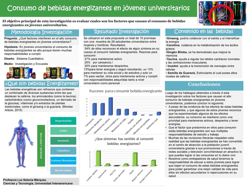 El consumo de bebidas energizantes en jóvenes universitarios ha tomado una gran alza, según algunos estudios realizados en diferentes universidades del mundo. Cabe señalar que existe evidencia de las complicaciones que pueden surgir con el alto consumo de las bebidas energizantes, incluso la muerte. Los jóvenes universitarios tienen una vida social alta y responsabilidades económicas que cumplir ―aparte de sus compromisos de estudios― y las bebidas energizantes se han convertido en la respuesta como solución para cumplir con dichas responsabilidades. El objetivo de esta propuesta de investigación fue describir los factores que causan el alto consumo de bebidas energizantes y cómo esto interfiere en su vida universitaria, social y familiar. La muestra se compuso de un total de 28 participantes, provenientes de universidades del área noreste. Se utilizó la aplicación "Survey Monkey" para la aplicación del cuestionario (ya que está dirigido a jóvenes universitarios tecnológicos). Al tratarse de una aplicación tan simple, logramos nuestros objetivos de recopilar los datos de una muestra de 28 participantes, usando diez premisas a contestar. La propuesta de investigación siguió un protocolo descriptivo cualitativo. En esta propuesta se describirán algunas de las características sociales que implican a los jóvenes universitarios. Gracias a la promoción errónea de estas bebidas energizantes, su consumo es alto, y es preocupante que la juventud lo considere como prioridad y herramienta necesaria para cumplir sus necesidades.