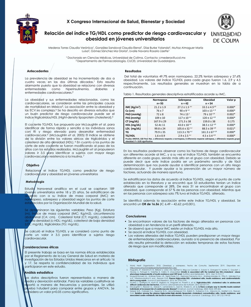 La prevalencia de la obesidad se ha incrementado de dos a cuatro veces en las dos últimas décadas. Esto resulta alarmante puesto que la obesidad se relaciona con diversas enfermedades como hiperinsulinemia, diabetes y enfermedades cardiovasculares. Se ha descrito en diversos estudios que un buen predictor de riesgo cardiovascular puede ser el índice triglicéridos/HDL (Hight-density lipoprotein cholesterol). Nuestro estudio captó 189 jóvenes universitarios entre 18 y 25 años. Se estratificaron de acuerdo con su IMC en normopeso, sobrepeso y obesidad de acuerdo con los puntos de corte establecidos por la Organización Mundial de la salud. Del total el 49.7% eran normopeso, 22.2% tenía sobrepeso y 27.6% obesidad. Los valores del índice TG/HDL para cada grupo fueron 1.6, 2.9 y 3.8 respectivamente. Estos valores fueron diferentes estadísticamente usando una prueba ANOVA (p<0.00001). Los valores alterados del índice TG/HDL pueden predisponer un mayor riesgo de enfermedades cardiovasculares, aunado a la presencia de obesidad. Por ello resulta primordial la detección en edades tempranas de estos factores de riesgo que son modificables.