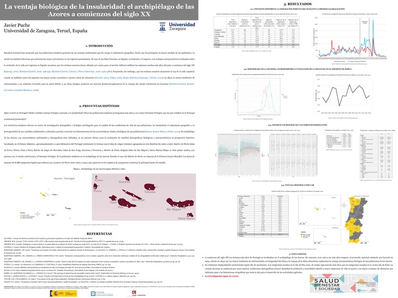 Este trabajo analiza, por primera vez, el estado nutricional y el bienestar biológico de la población portuguesa en el archipiélago de las Azores. Estudia el caso del distrito de Horta en vísperas de la Primera Guerra Mundial. Los datos de estatura de 8188 emigrantes legales que salieron por el puerto de Horta entre 1900 y 1914 y que aparecen en los registros de pasaportes constituye la principal fuente de estudio. Los resultados provisionales revelan dos conclusiones: a) A comienzos del siglo XX los varones (de 18 años) más altos de Portugal se localizaban en el archipiélago de las Azores. En concreto, eran casi 4 cm más altos respecto al promedio nacional estimado por Lacerda en 1904, cifrado en 163,2 cm. La menor incidencia de enfermedades, la benignidad del clima y la singularidad de la dieta alimenticia explicarían la ventaja antropométrica de las Azores. b) Se evidencian desigualdades nutricionales según isla de nacimiento. Los emigrantes nacidos en la isla de Pico eran, de media, ligeramente más altos que los emigrantes nacidos en la vecina isla de Faial. La ventaja picoense se explicaría por unas mejores condiciones demográficas (menor densidad de población, menor mortalidad infantil y mayor esperanza de vida al nacer) y un mayor consumo de alimentos por habitante pese a las limitaciones orográficas que tenía la isla para el desarrollo de las actividades agrícolas.