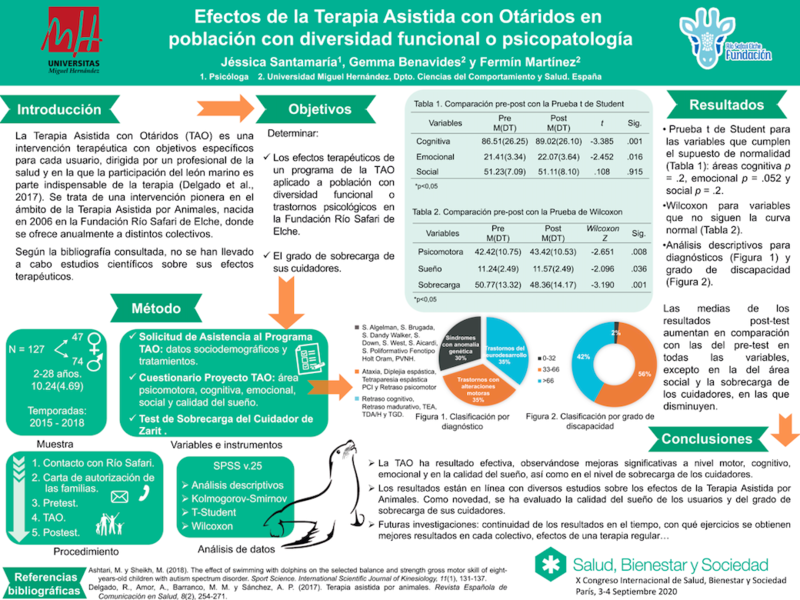 El objetivo es analizar los efectos terapéuticos de la terapia asistida con otáridos (TAO) en población con diversidad funcional o psicopatología. Para ello se ha llevado a cabo un estudio cuasi-experimental pre-post con una muestra de N=127, en el que se han evaluado, además de los datos sociodemográficos de los usuarios, diversas variables relativas a las áreas psicomotora, emocional, cognitiva, social y calidad del sueño, así como el grado de sobrecarga de sus cuidadores. La TAO se llevó a cabo a lo largo de diez sesiones, cada una con una fase de socialización, otra de relajación y otra de interacción con los leones marinos. Los resultados pusieron de manifiesto que tras la TAO se produjo una mejora significativa en todas las variables analizadas, a excepción de la de socialización, con lo que se puede concluir que, en general, la terapia asistida con leones marinos tiene efectos terapéuticos positivos para estas poblaciones y sus cuidadores.