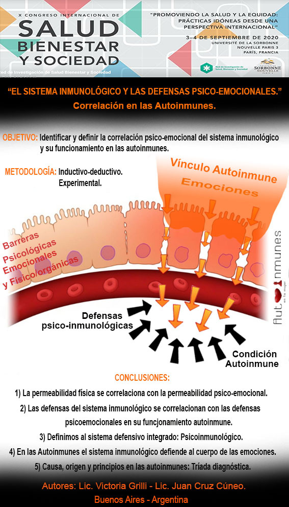 Estamos realizando una investigación desde hace 5 años respecto a las enfermedades autoinmunes en mujeres. Y estamos encontrando muchas correlaciones entre el sistema inmunológico y las defensas psicoemocionales; aspectos, funcionamientos, características y la manera en que se ven afectados ambos sistemas en el marco de las enfermedades autoinmunes. Queremos presentar en este póster, de manera gráfica y visible y representativa, los aspectos, características y correlaciones observadas en las mujeres con autoinmunes. Consideramos que será un gran aporte y avance para el trabajo en las enfermedades autoinmunes en la mujer.