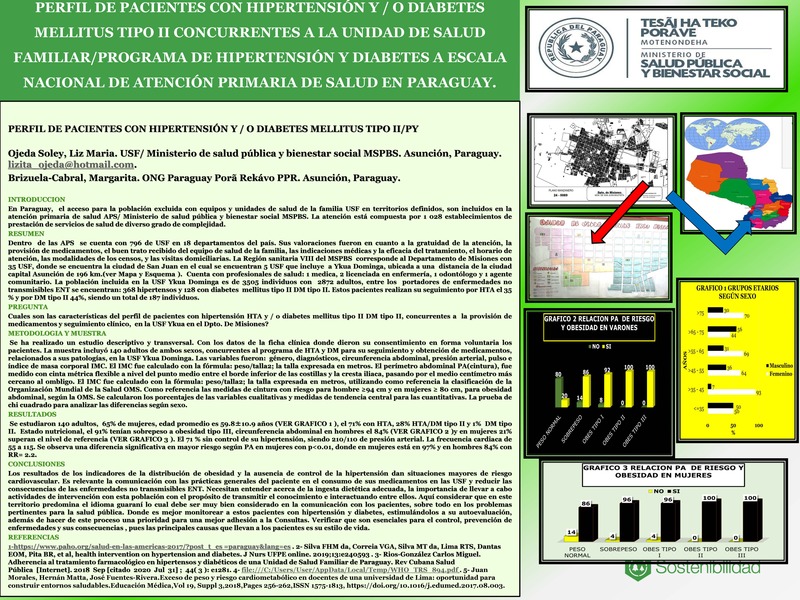En Paraguay, el acceso para la población excluida con equipos y unidades de salud de la familia USF en territorios definidos, son incluidos en la atención primaria de salud APS/Ministerio de salud pública y bienestar social. Se plantea analizar las características de los pacientes, con hipertensión HTA y/o diabetes mellitus tipo II DM tipo II, concurrentes a la provisión de medicamentos y seguimiento clínico, en la USF Ykau en el Dpto. De Misiones. Se observaron género, diagnósticos, circunferencia abdominal, presión arterial, pulso e índice de masa corporal IMC. Se estudiaron 140 adultos, 65% de mujeres, edad promedio de 59.8±10.9 años, el 71% con HTA, 28% HTA/DM tipo II y 1% DM tipo II. Estado nutricional: el 91% tenían sobrepeso a obesidad tipo III, circunferencia abdominal en hombres el 84% y en mujeres 21% superan el nivel de referencia. El 71 % sin control de su hipertensión, siendo 210/110 de presión arterial. La frecuencia cardiaca de 55 a 115. Los resultados de los indicadores de la distribución de obesidad y la ausencia de control de la hipertensión dan situaciones mayores de riesgo cardiovascular. Es relevante la comunicación con las prácticas generales del paciente en el consumo de sus medicamentos en las USF y reducir las consecuencias de las enfermedades no transmisibles ENT.