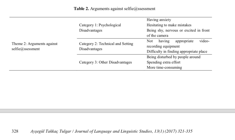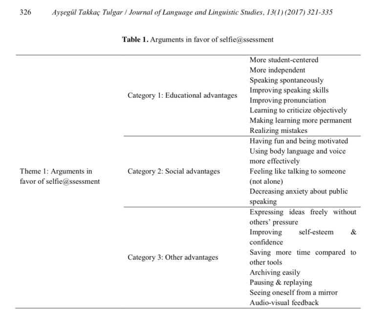 Tulgar, A. T. (2017). Selfie@ ssessment as an alternative form of self-assessment at undergraduate level in higher education. Journal of Language and Linguistic Studies, 13(1), 321-335.
