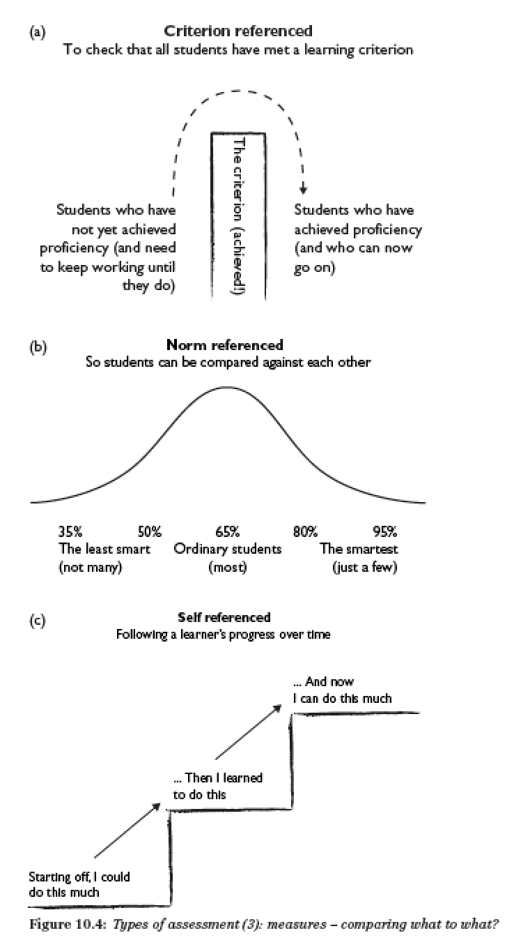 Criterion referenced, norm-referenced and self-referenced assessments have fundamentally different logics and social purposes. In the following image from Chapter 10 of our New Learning book, we attempt to characterize the different logics. But what are the different social assumptions?