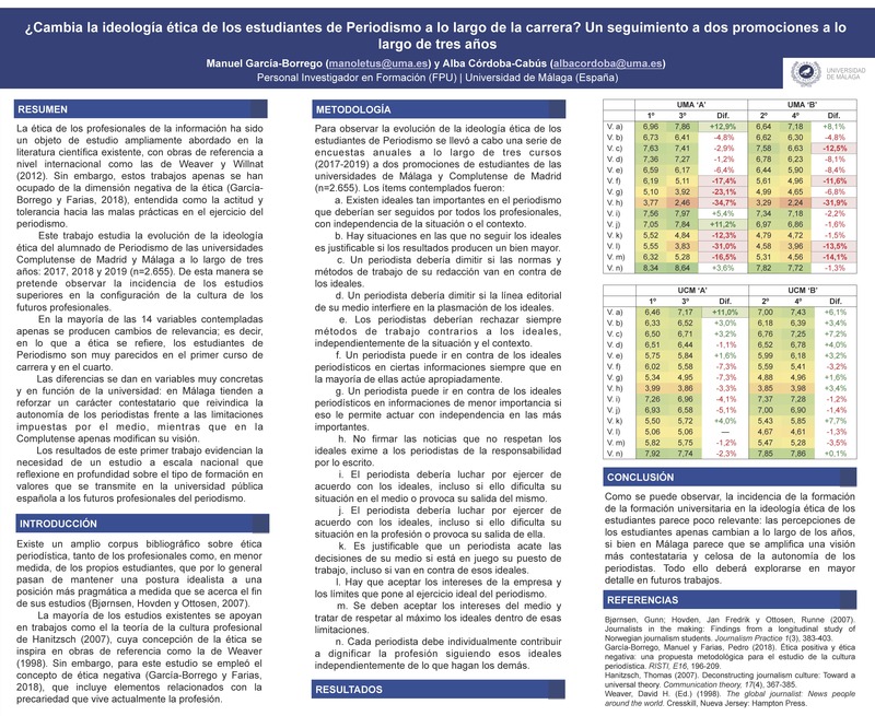 La ética de los profesionales de la información ha sido un objeto de estudio ampliamente abordado en la literatura científica existente, con obras de referencia a nivel internacional como las de Weaver y Willnat. Sin embargo, estos trabajos apenas se han ocupado de la dimensión negativa de la ética, entendida como la actitud y tolerancia hacia las malas prácticas en el ejercicio del periodismo. Este trabajo estudia la evolución de la ideología ética del alumnado de Periodismo de las universidades Complutense de Madrid y Málaga a lo largo de tres años: 2017, 2018 y 2019 (n=2.655). De esta manera se pretende observar la incidencia de los estudios superiores en la configuración de la cultura de los futuros profesionales. En la mayoría de las 14 variables contempladas apenas se producen cambios de relevancia; es decir, en lo que a ética se refiere, los estudiantes de Periodismo son muy parecidos en el primer curso de carrera y en el cuarto. Las diferencias se dan en variables muy concretas y en función de la universidad: en Málaga tienden a reforzar un carácter contestatario que reivindica la autonomía de los periodistas frente a las limitaciones impuestas por el medio, mientras que en la Complutense apenas modifican su visión. Los resultados de este primer trabajo evidencian la necesidad de un estudio a escala nacional que reflexione en profundidad sobre el tipo de formación en valores que se transmite en la universidad pública española a los futuros profesionales del periodismo.