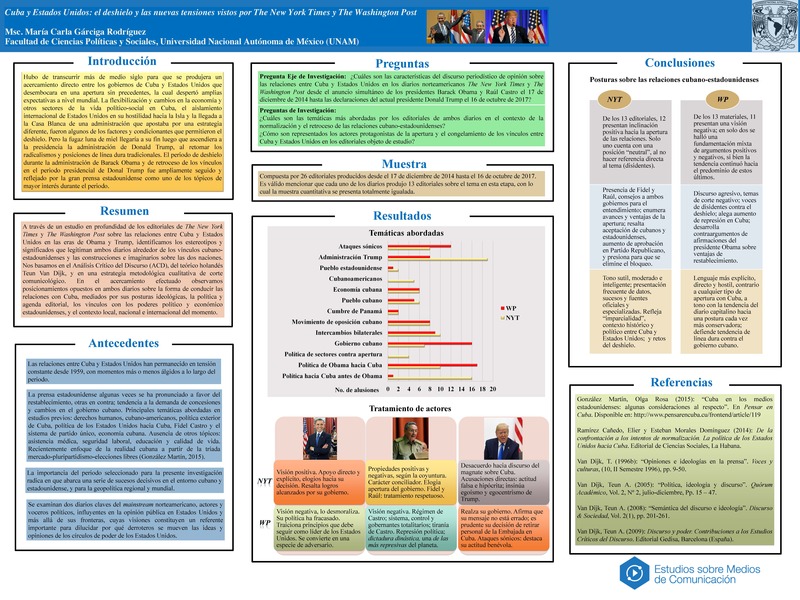 La investigación efectúa un análisis crítico comparativo del discurso periodístico en los diarios del mainstream estadounidense The New York Times y The Washington Post, sobre las relaciones entre Cuba y Estados Unidos, desde el anuncio simultáneo de los presidentes Barack Obama y Raúl Castro el 17 de diciembre de 2014 hasta las declaraciones del actual presidente Donald Trump el 16 de octubre de 2017. Para ello se toman en cuenta los estereotipos y significados que legitiman ambos periódicos en los textos de opinión que conforman la muestra, las estrategias y estructuras discursivas más utilizadas, las relaciones que se infieren con los poderes político y económico estadounidense, el tratamiento de los personajes políticos protagonistas implicados, los tópicos fundamentales abordados dentro del proceso de deshielo y retroceso de los vínculos, así como las principales fuentes utilizadas en la construcción del discurso de opinión de los textos seleccionados. Se acude a la estrategia de Análisis Crítico del Discurso (ACD) desarrollada por el teórico holandés Teun Van Dijk y como soporte teórico a la Economía Política de la Comunicación.