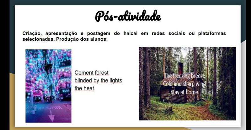Como os outros colegas, Juliano, também gostei muito da atividade. É uma ótima ideia se conectar às emoções dos alunos através da poesia. Em um dos meus cursos de graduação, comecei o semestre online com uma poesia também escrita pelos alunos. Queria sondar a saúde mental deles durante a pandemia e as emoções que eles tinham. O poema que foi mais comentado pelos alunos foi sobre a falta que o vínculo social faz durante a pandemia e a esperança de voltarmos a nos abraçar. Gostei muito das produções Haicai dos seus alunos. Também é interessante observar que ainda a maioria não incorpora o verbal ao visual, mas o separa (vestígios das percepções modernas sobre linguagem).