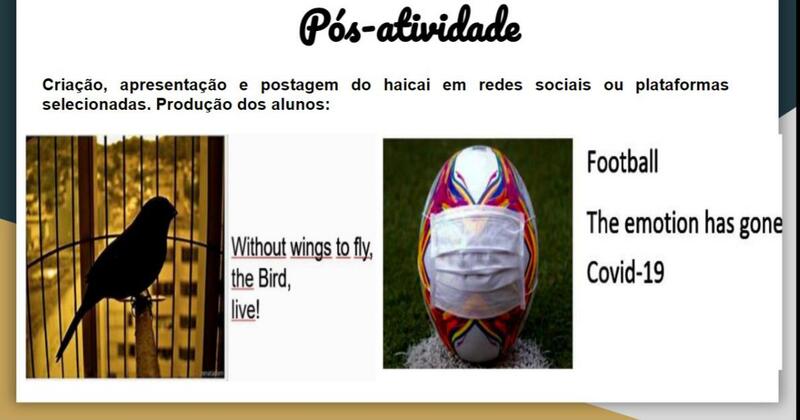Com início da pandemia, em março de 2020, iniciei uma aula de língua inglesa com o 3.º do ensino médio em que a primeira atividade era um poema: Haiku. Aproveitando o contexto pandêmico e o poema, expliquei um pouco sobre o conceito e os estimulei a criarem haicai em grupos. Abaixo seguem alguns resultado. Note-se que essa aula foi feita de forma remota, via plataforma zoom.