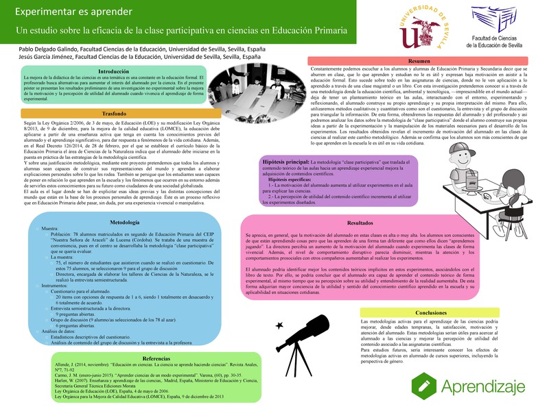 Constantemente podemos escuchar a los alumnos y alumnas de Educación Primaria y Secundaria decir que se aburren en clase, que lo que aprenden y estudian no le es útil para nada, que están hartos de ir al colegio o al instituto y esto sucede sobre todo en las asignaturas de ciencias, donde no le ven aplicación a lo aprendido a través de una clase magistral o un libro. Con esta investigación pretendemos conocer si a través de una metodología donde la educación científica, ambiental y tecnológica, —imprescindible en el mundo actual— deja de tener un planteamiento teórico en las aulas, interactuando con el entorno, experimentando y reflexionando, el alumnado construye su propio aprendizaje y su propia interpretación del mismo. Para ello, utilizaremos métodos cualitativos y cuantitativos como son el cuestionario, la entrevista y el grupo de discusión con el fin de obtener todos los datos posibles para nuestra investigación. De esta forma, obtendremos las respuestas del alumnado y del profesorado y así podremos analizar los datos sobre la metodología de “clase participativa” donde el alumno construye sus propias ideas a partir de la experimentación y la manipulación de los materiales necesarios para el desarrollo de los experimentos. Los resultados obtenidos revelan el incremento de motivación del alumnado en las clases de ciencias al realizar este cambio metodológico. Además se confirma que los alumnos son más conscientes de que lo que aprenden en la escuela le es útil en su vida cotidiana.