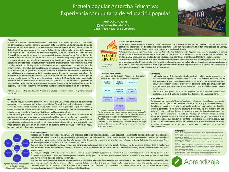 El sistema capitalista y neoliberal hegemónico ha conducido en diversos países a la privatización de derechos fundamentales como la educación. Esto se evidencia en la disminución de oferta educativa en el sector público y la reducción de inversión estatal en ella, como sucede en Colombia. Así, para una persona proveniente de la periferia, se hace cada vez más difícil acceder a un cupo en una Institución de Educación Superior, pues los sistemas de admisión han favorecido la entrada de personas con mejores condiciones socioeconómicas. Con el objetivo de reducir la brecha educativa que se da en el acceso a la educación superior, surgen una serie de procesos e iniciativas que se enfocan en contrarrestar los efectos propios de la política educativa del Estado, empoderando a la comunidad y resistiendo ante el modelo educativo imperante. Una de ellas, en la ciudad de Bogotá, especialmente en los barrios populares, consta de una serie de preuniversitarios gratuitos, que basados en las ideas pedagógicas provenientes de Paulo Freire y otras iniciativas del sur global, han trabajado junto con la comunidad para el refuerzo y desarrollo de habilidades y la preparación de la juventud para enfrentar los exámenes estatales y de admisión a las universidades públicas. Este artículo presenta las experiencias vividas por la escuela popular Antorcha Educativa en la localidad bogotana de Kennedy (también denominada Techotiva por sus habitantes) y su articulación con otros procesos de educación popular y otra serie de iniciativas comunitarias en aras de construir tejido social en el territorio.