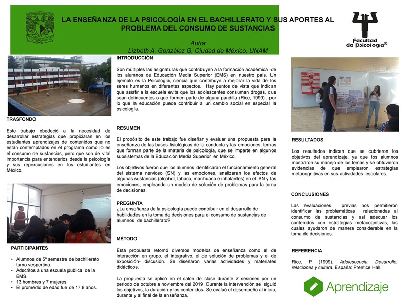 El propósito de este trabajo fue diseñar y evaluar una propuesta para vincular el tema sobre el consumo de sustancias en los bloques temáticos del programa de Psicología 1 del bachillerato general como parte de un subsistema de la Educación Media Superior. Esta propuesta retomó diversos modelos de enseñanza y se diseñaron varias actividades y materiales didácticos. La finalidad fue brindarles a los adolescentes herramientas que los apoyen y orienten para la toma de decisiones, integrando temas como campos de aplicación de consumo de sustancias para su posible tratamiento, efectos del consumo de sustancias en el sistema nervioso y las emociones que genera el consumo, así como sus posibles consecuencias.