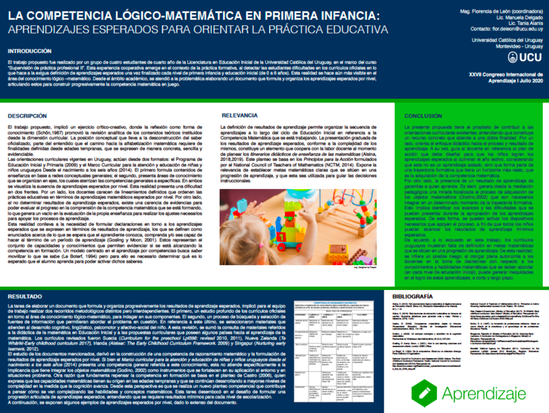 El trabajo propuesto fue realizado por un grupo de cuatro estudiantes de cuarto año de la Licenciatura en Educación Inicial de la Universidad Católica del Uruguay, en el marco del curso “Supervisión de práctica profesional II”. Esta experiencia cooperativa emerge en el contexto de la práctica formativa, al detectar las estudiantes dificultades en los currículos oficiales en lo referente a la exigua definición de aprendizajes esperados una vez finalizado cada nivel de primera infancia y educación inicial. Esta realidad se hace aún más visible en el área del conocimiento lógico-matemático. Desde el ámbito académico, se atendió a la problemática elaborando un documento que organiza los aprendizajes esperados, determinando los conocimientos y habilidades que se deben alcanzar por nivel para construir progresivamente y de manera articulada la competencia matemática en juego. Esta experiencia implicó un ejercicio crítico-creativo, que promovió la revisión analítica de los contenidos teóricos instituidos desde la dimensión curricular. La posición conceptual que lleva a la deconstrucción del saber oficializado, parte del supuesto de que el camino hacia la alfabetización matemática requiere de finalidades definidas desde edades tempranas, que se expresen de manera concreta, sencilla y evidenciable. La presentación graduada de los aprendizajes esperados, conforme a la complejidad de los mismos, constituye un elemento que coopera con la labor docente al momento de planificar en el campo formativo en cuestión.