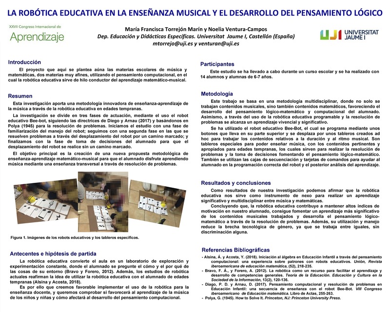 El objetivo principal de esta investigación es la creación de una nueva propuesta metodológica de enseñanza-aprendizaje que aúna las materias de matemáticas y música, para que el alumnado disfrute aprendiendo música mediante una enseñanza transversal del pensamiento computacional y multidisciplinar, a través de resolución de problemas, utilizando la robótica educativa en edades tempranas como hilo conductor. Este estudio se ha llevado a cabo durante un curso escolar y se ha realizado con 14 alumnos y alumnas de 6 años. Se ha utilizado el robot educativo Bee-Bot, el cual se programa mediante unos botones que lleva en su parte superior y se desplaza por unos tableros creados específicamente para trabajar los contenidos relativos a la duración y al ritmo musical. La investigación se divide en tres fases de actuación, siguiendo las directrices de Diego y Arnau y basándonos en Polya para la resolución de problemas. Iniciamos el estudio con una fase de familiarización del manejo del robot; seguimos con una segunda fase en las que se resuelven problemas a través del desplazamiento del robot por un camino marcado; y finalizamos con la fase de toma de decisiones del alumnado para que el desplazamiento del robot se realice sin un camino marcado. Como resultados y conclusiones podemos afirmar que la robótica educativa contribuye a mantener altos índices de motivación en nuestro alumnado, consigue fomentar un aprendizaje más significativo de los contenidos musicales trabajados y desarrolla el pensamiento lógico-matemático a través de la resolución de problemas.
