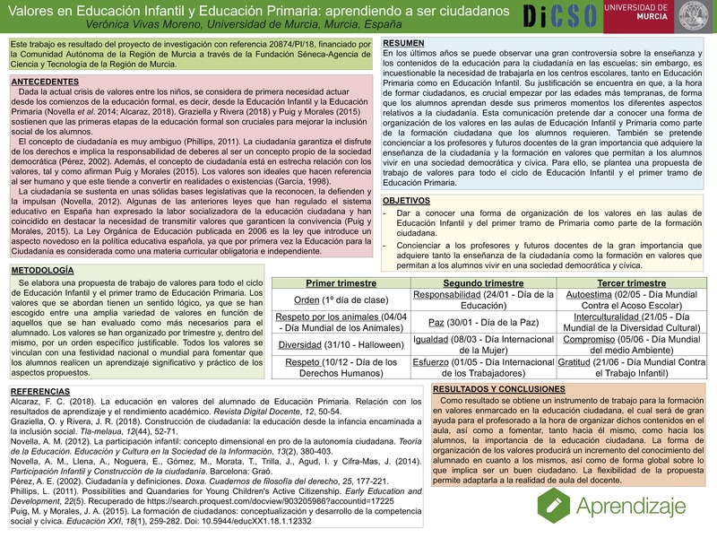 En los últimos años se puede observar una gran controversia sobre la enseñanza y los contenidos de la educación para la ciudadanía en las escuelas; sin embargo, es incuestionable la necesidad de trabajarla en los centros escolares, tanto en Educación Primaria como en Educación Infantil. Su justificación se encuentra en que, a la hora de formar ciudadanos, es crucial empezar por las edades más tempranas, de forma que los alumnos aprendan desde sus primeros momentos los diferentes aspectos relativos a la ciudadanía. Esta comunicación pretende dar a conocer una forma de organización de los valores en las aulas de Educación Infantil y Primaria como parte de la formación ciudadana que los alumnos requieren. También se pretende concienciar a los profesores y futuros docentes de la gran importancia que adquiere la enseñanza de la ciudadanía y la formación en valores que permitan a los alumnos vivir en una sociedad democrática y cívica. Para ello, se plantea una propuesta de trabajo de valores para todo el ciclo de Educación Infantil y el primer tramo de Educación Primaria. Los valores que se abordan con la propuesta planteada tienen un sentido lógico, ya que se han escogido entre una amplia variedad de valores en función de aquellos que se han considerado como más necesarios para el alumnado de las edades correspondientes. Todos los valores se vinculan con una festividad nacional o mundial para fomentar que los alumnos realicen un aprendizaje significativo y práctico de los aspectos propuestos.