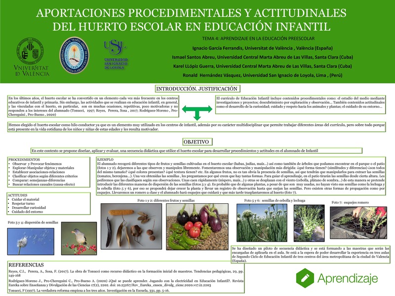 En los últimos años, el huerto escolar se ha convertido en un elemento cada vez más frecuente en los centros educativos de infantil y primaria. Sin embargo, las actividades que se realizan vinculadas con el huerto son, en muchas ocasiones, repetitivas, poco motivadoras y no responden a los intereses del alumnado. Por otro lado, el currículo de Educación Infantil incluye contenidos procedimentales como el estudio del medio mediante investigaciones y proyectos, descubrimiento por exploración y observación, etc. También contenidos actitudinales como el desarrollo de la curiosidad, cuidado y respeto hacia los animales y plantas, entre otros. En este contexto se propone diseñar, aplicar y evaluar, una secuencia didáctica que utilice el huerto escolar para desarrollar procedimientos y actitudes en el alumnado de Infantil. Hemos elegido el huerto escolar como hilo conductor ya que es un elemento muy utilizado en los centros de infantil, además de su carácter multidisciplinar que permite trabajar diferentes áreas del currículo; pero, sobre todo, porque está presente en la vida cotidiana de los niños y niñas de estas edades y les resulta motivador. En el momento actual se ha diseñado un piloto de secuencia didáctica y se está formando a las maestras que serán las encargadas de aplicarla en el aula. Al ser un trabajo en curso, solamente se presentan resultados preliminares a la espera de poder desarrollar la experiencia en tres aulas de Segundo Ciclo de Educación Infantil de tres centros del área metropolitana de la ciudad de Valencia (España).