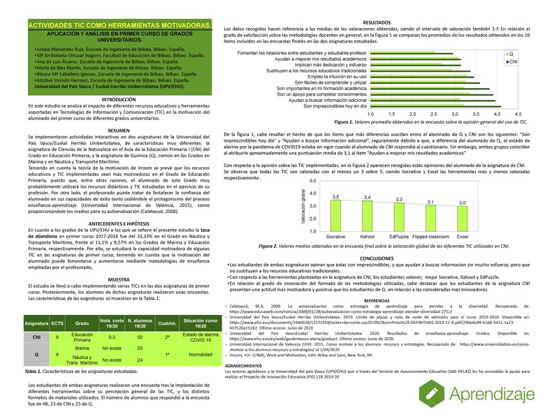 En este estudio se analiza el impacto de diferentes recursos educativos y herramientas soportadas en Tecnologías de Información y Comunicación (TIC) en la motivación del alumnado del primer curso de diferentes grados universitarios. Para ello, se implementaron actividades interactivas en dos asignaturas de la Universidad del País Vasco/Euskal Herriko Unibertsitatea, de características muy diferentes: la asignatura de Ciencias de la Naturaleza en el Aula de la Educación Primaria I del Grado en Educación Primaria; y la asignatura de Química, común en los Grados en Marina y en Náutica y Transporte Marítimo. Teniendo en cuenta la teoría de la motivación de Vroom se prevé que los recursos educativos y TIC implementadas sean más motivadoras en el Grado de Educación Primaria, puesto que, entre otras razones, el alumnado de este Grado muy probablemente utilizará los recursos didácticos y TIC estudiadas en el ejercicio de su profesión. En esta línea el alumnado de CNI da una mejor valoración a todas las utilidades de las herramientas utilizadas respecto al grupo de Q. En términos generales, según todos los estudiantes encuestados, las TIC son imprescindibles hoy en día en la formación académica, son fáciles de comprender y de utilizar por ser intuitivas. Los principales inconvenientes de usar TIC que apuntan ambos grupos son que no se fomentan las relaciones entre estudiantes ni estudiante-profesor, y que los estudiantes consideran que apenas mejoran, sustancialmente, sus resultados académicos.