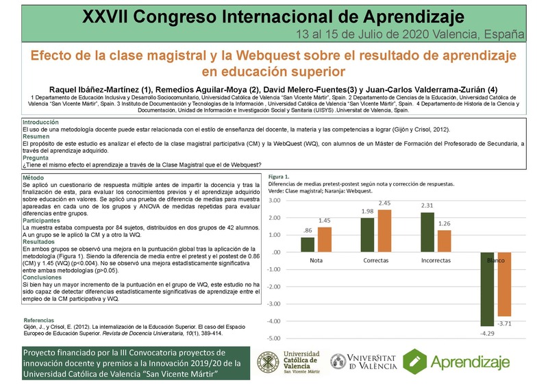 El uso de una metodología docente puede estar relacionada con el estilo de enseñanza del docente, la materia y las competencias a lograr. El propósito de este estudio es analizar el efecto de la clase magistral participativa (CM) y la WebQuest (WQ), con alumnos de un Máster de Formación del Profesorado de Secundaria. La muestra estaba compuesta por 84 sujetos, distribuidos en dos grupos de 42 alumnos. A un grupo se le aplicó CM y a otro WQ. Se aplicó un cuestionario de respuesta múltiple antes de impartir la docencia y tras la finalización de ésta, para evaluar los conocimientos previos y el aprendizaje adquirido sobre educación en valores. Se aplicó una prueba de diferencia de medias para muestra apareadas en cada uno de los grupos y ANOVA de medidas repetidas para evaluar diferencias entre grupos. En ambos grupos se observó una mejora en la puntuación global tras la aplicación de la metodología, siendo la diferencia de media entre el pretest y el postest de 0.86 (CM) y 1.45 (WQ) (p<0.004). No se observó una mejora estadísticamente significativa entre ambas metodologías (p>0.05), si bien hay un mayor incremento de la puntuación en el grupo de WQ, este estudio no ha sido capaz de detectar diferencias estadísticamente significativas de aprendizaje entre el empleo de la CM y WQ. Gijón, J., y Crisol, E.