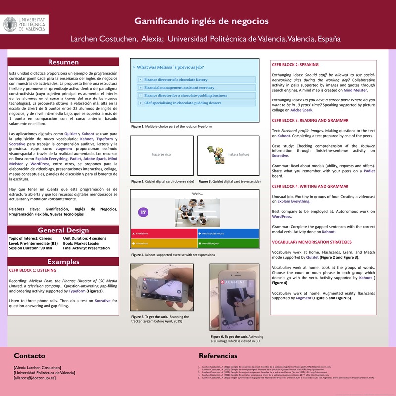 Esta unidad didáctica proporciona un ejemplo de programación curricular gamificada para la enseñanza del inglés de negocios. La propuesta tiene una estructura flexible y promueve el aprendizaje activo dentro del paradigma constructivista (cuyo objetivo principal es aumentar el interés de los alumnos en el curso a través del uso de las nuevas tecnologías). Las aplicaciones digitales como Quizlet y Brainscape se usan para la adquisición de nuevo vocabulario; Kahoot y Socrative para trabajar la comprensión lectora y la gramática. Apps como Augment proporcionan estímulo visuoespacial a través de la realidad aumentada. Los recursos en línea como Explain Everything, Padlet y WordPress, entre otros, se proponen para la elaboración de videoblogs, presentaciones interactivas, paneles de discusión y para el fomento de la escritura. Hay que tener en cuenta que esta unidad didáctica es sólo una entre varias opciones, y que los recursos digitales mencionados se actualizan y modifican constantemente.