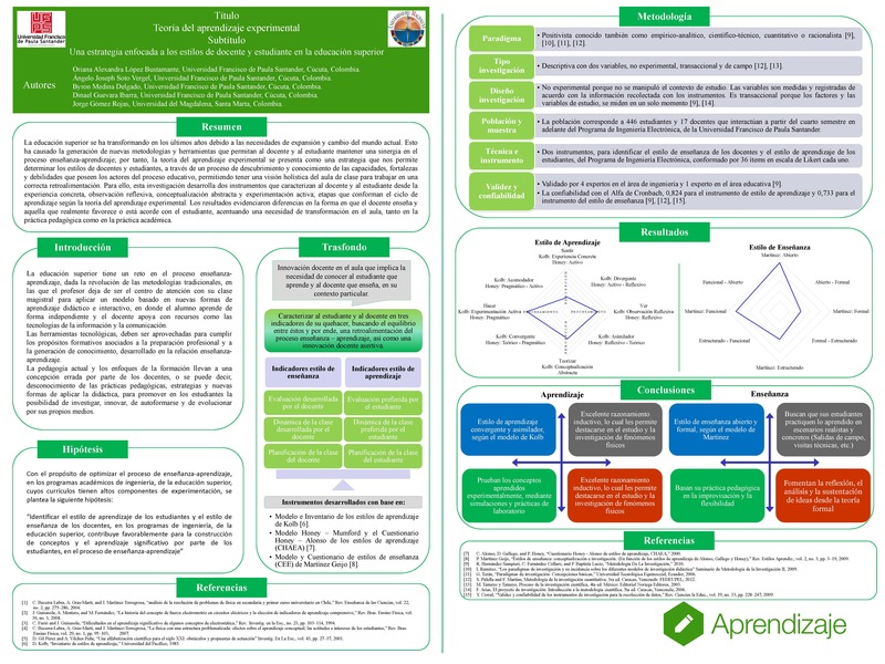 La educación superior se ha ido transformando en los últimos años debido a las necesidades de expansión y cambio del mundo actual. Esto ha causado que se generen nuevas metodologías y herramientas que permitan al docente y al estudiante mantener una sinergia en el proceso enseñanza-aprendizaje. Por tanto, la teoría del aprendizaje experimental se presenta como una estrategia que nos permite determinar los estilos de docentes y estudiantes a través de un proceso de descubrimiento y conocimiento de las capacidades, fortalezas y debilidades que poseen los actores del proceso educativo, permitiendo tener una visión holística del aula de clase para trabajar en una correcta retroalimentación. Para ello, esta investigación desarrolla dos instrumentos que caracterizan al docente y al estudiante desde la experiencia concreta, observación reflexiva, conceptualización abstracta y experimentación activa; etapas que conforman el ciclo de aprendizaje según la teoría del aprendizaje experimental. Los resultados evidenciaron diferencias en la forma en que el docente enseña y aquella que realmente favorece o está acorde al estudiante, acentuando una necesidad de transformación en el aula, tanto en la práctica pedagógica como en la práctica académica.