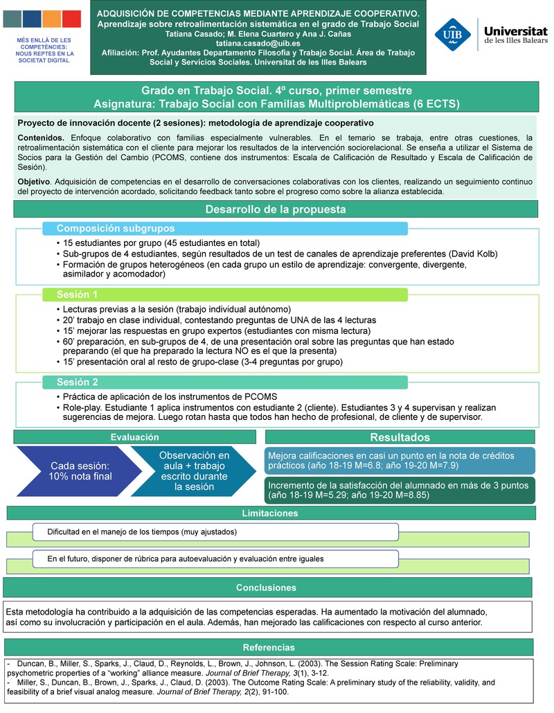 La adquisición de competencias es uno de los grandes retos que plantea el plan Bolonia en los grados universitarios. Este proyecto de innovación docente se ha desarrollado en la Universitat de les Illes Balears durante el curso académico 2019-2020, en el marco de la asignatura “Trabajo Social con familias multiproblemáticas” (código del proyecto: PID192064). Se utiliza el aprendizaje cooperativo como metodología para la adquisición de competencias de estudiantes de trabajo social. El objetivo es el manejo adecuado, por parte del alumnado de Trabajo Social, de la retroalimentación sistemática con personas usuarias de servicios sociales que se encuentran en situación de especial dificultad. Los resultados de este proyecto muestran un aumento del rendimiento académico del estudiantado (comparando las calificaciones obtenidas por otros grupos en años anteriores, en los que se ha desarrollado la asignatura con métodos tradicionales de aprendizaje). Además, muestran tasas más elevadas de satisfacción con la parte práctica de esta asignatura.