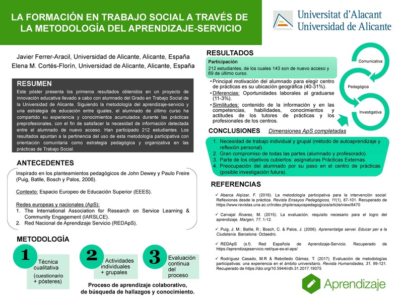 Esta comunicación presenta los primeros resultados obtenidos en un proyecto de innovación educativa llevado a cabo con alumnado del Grado en Trabajo Social de la Universidad de Alicante. Siguiendo la metodología del aprendizaje-servicio y una estrategia de educación entre iguales, el alumnado de último curso ha compartido su experiencia y conocimientos acumulados durante las prácticas preprofesionales, con el fin de satisfacer la necesidad de información detectada entre el alumnado de nuevo acceso. Han participado 212 estudiantes. Los resultados apuntan a la pertinencia del uso de esta metodología participativa con orientación comunitaria como estrategia pedagógica y organizativa en las prácticas de Trabajo Social.