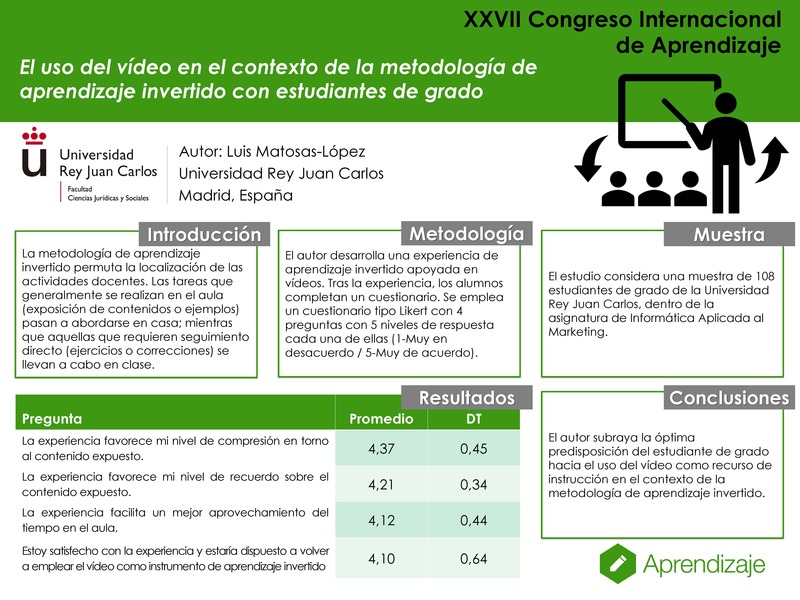 La base de la metodología de aprendizaje invertido es la de permutar la localización de las actividades docentes. Las tareas que generalmente se realizan en el aula (exposición de contenidos o ejemplos) pasan a abordarse en casa, mientras que aquellas que requieren seguimiento directo (ejercicios o correcciones) se llevan a cabo en clase. El presente trabajo explora la percepción que el estudiante de grado tiene de esta metodología de aprendizaje. El estudio considera una muestra de 108 estudiantes de grado de la Universidad Rey Juan Carlos, dentro de la asignatura de Informática Aplicada al Marketing. El autor desarrolla una experiencia de aprendizaje invertido apoyada en vídeos sobre varios contenidos del curso. Tras la experiencia, los alumnos completan un cuestionario con el propósito de evaluar: a) nivel de compresión del contenido expuesto, b) nivel de recuerdo del contenido expuesto, c) aprovechamiento de la experiencia, d) satisfacción con la experiencia. Para ello, se emplea un cuestionario con cuatro preguntas tipo Likert con cinco grados (1-Muy en desacuerdo / 5-Muy de acuerdo). Los resultados revelan la excelente percepción del alumnado. Entre los hallazgos obtenidos destacan los elevados niveles de compresión y recuerdo alcanzados (4,37 y 4,21 respectivamente). Asimismo, se observan también buenos promedios en las preguntas relativas al aprovechamiento y satisfacción con la experiencia (4,12 y 4,10 respectivamente). A la vista de los resultados, el autor subraya la óptima predisposición del estudiante de grado hacia el uso del vídeo como recurso de instrucción en el contexto de la metodología de aprendizaje invertido.