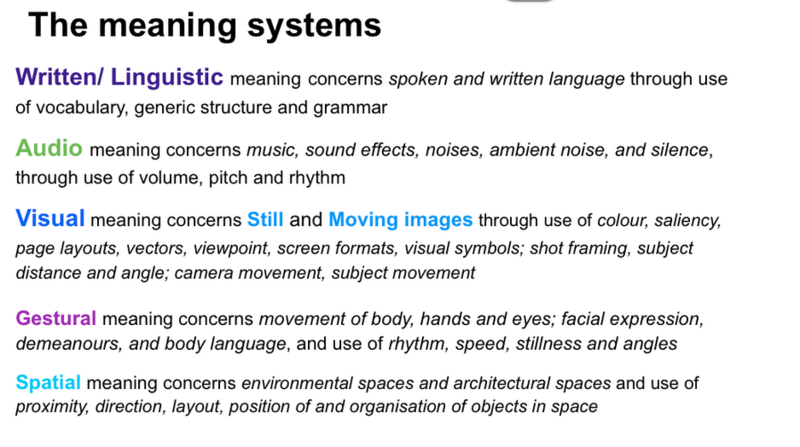 According to the New London Group there are five communication modes, or broad meaning making systems[1]: