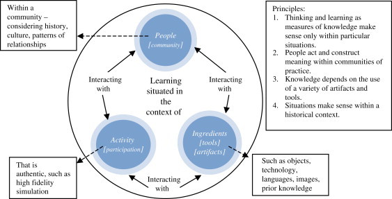 In the image below we can see the general framework for situated cognition. We can see it involves the importance of the context of the community, along with activities that through particpation create authentic knowledge along with artifacts that reinforce the lessons.