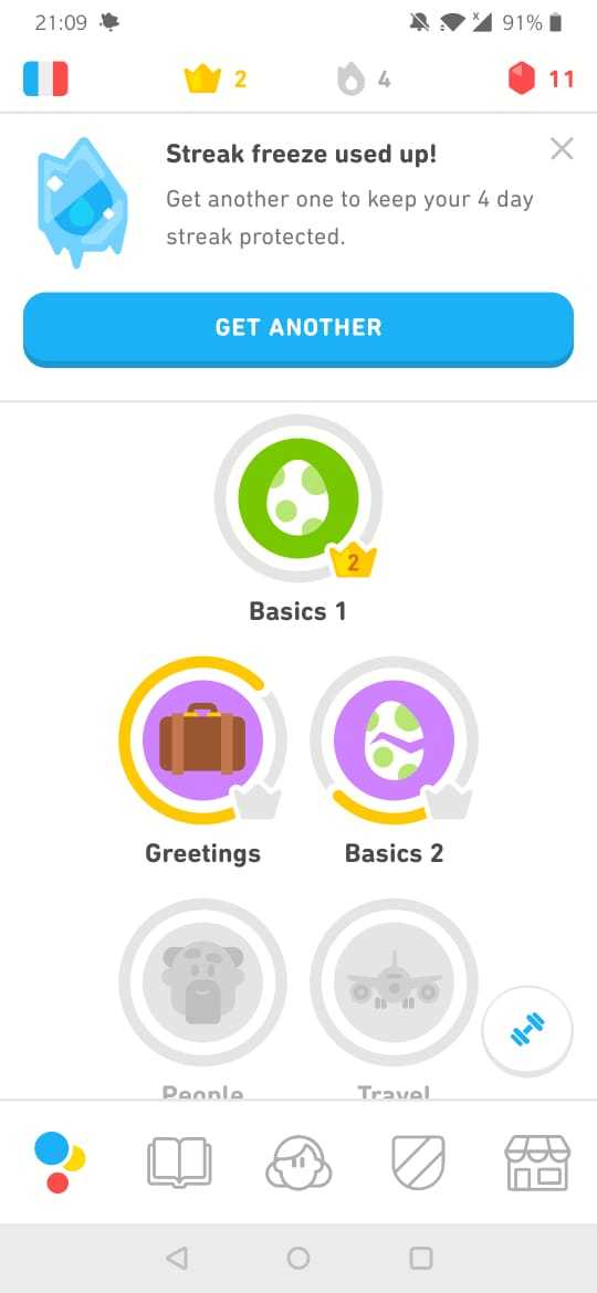You also need to choose answers and write them when prompted. Here are a few screenshots (this is Day 5 of my French lessons!) The landing page of Duolingo – you can see gamified elements here. The progress report also has elements of gamification as shown below.