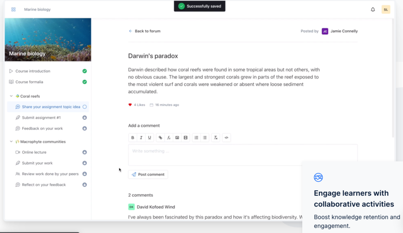 EduFlow is a course authoring application that seems to almost be the solution for allowing an instructor to author courses, track personal student progress, and provide feedback opportunities. While the highlight/feedback features are less robust than Actively Learn, there is still the capability to provide feedback so that teachers can understand quickly what a student’s individual needs are. It also exposes tracking of student engagement with peers, encouraging collaborative development.