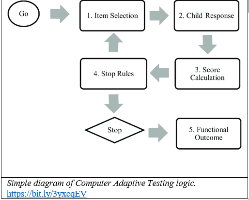 Computer-adaptive tests or CAT are designed to adjust the level of difficulty of testers—based on the responses they provided—to match the knowledge and ability of a tester. If a tester gives a wrong answer, the computer follows up with an easier question; if the tester answers correctly, the next question will be more difficult1. This capability is featured in many in-class and online computer instructional programs. When I was an elementary school teacher, CAT was featured in at least 3 of our computer programs from Pre-kindergarten through 5th grade. Below is a simple diagram of the logic used in CAT.