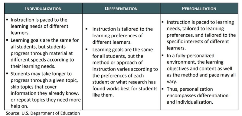 The U.S. Department of Education distinguishes between individualization, differentiation, and personalization of instruction since some educators use the terms interchangeably. Personalized instruction encompasses aspects of both differentiated instruction, which refers to adjusting the learning approach, and individualized instruction, which refers to adjusting the pace of learning. Table 1. illustrates the distinguishing features of individualized, differentiated, and personalized instruction (Hanover Research, 2014).