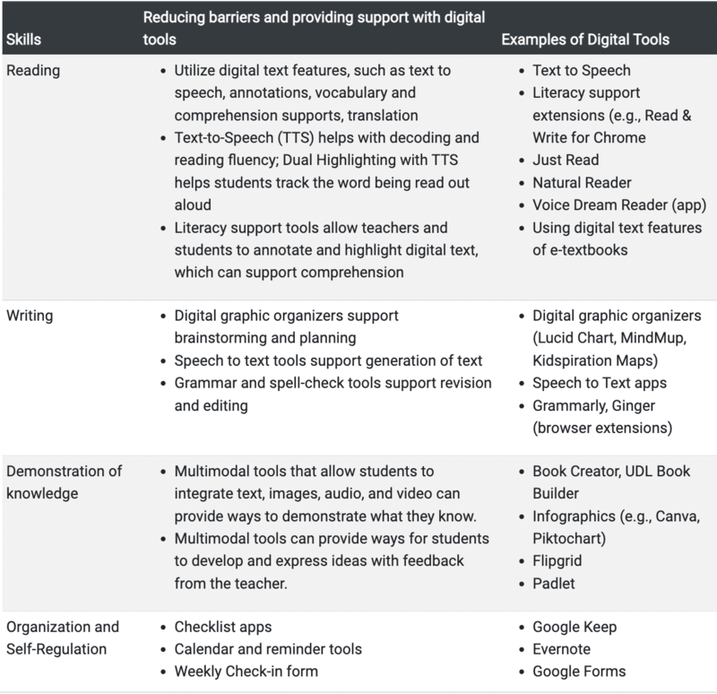 Schools and institutions (as well as the individual) who have access to the internet and resources to invest in software for differentiation have a myriad of choices to make. While there are an abundance of educational applications and platforms available, an emphasis in Universal Design and accessibility must be on the forefront of the consideration process (Rao, 2021). Universal Design in Learning (UDL) is a method by which all students can benefit, a framework that is flexible and able to adjust to the different levels and abilities of the learner. This UDL concept has given birth to assistive technologies, some of which are chronicled in the below image: