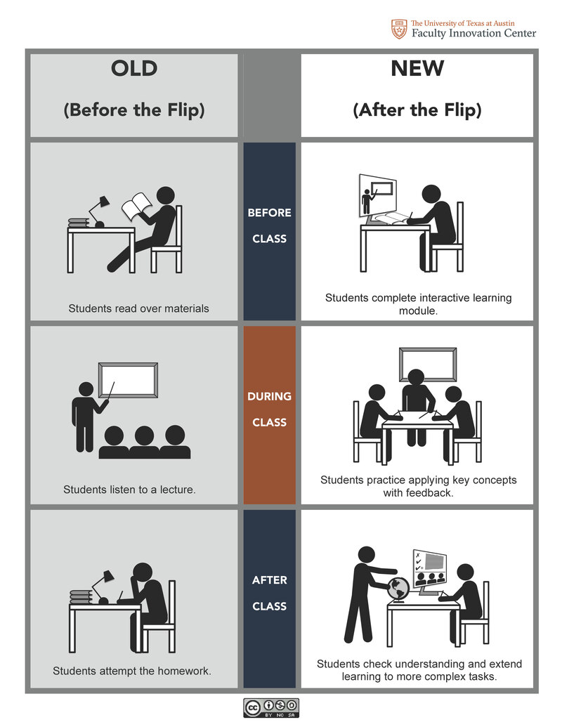 Bellow, is a picture provided by The Center for Teaching and Learning at the University of Texas, Austin that gives an idea of the differences in the way students learn and interact during classroom between traditional learning and employing flipped classroom method.