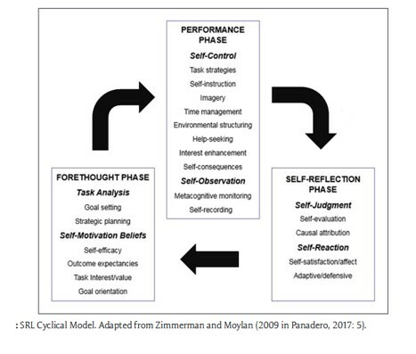 Different models for self-regulated learning exist. According to the model by Pintrich (2000), the SRL process contain four phases, namely 1) Forethought, planning and activation; 2) monitoring, 3) control; and 4) reaction and reflection. As such, they definitely contain elements of metacognition. Zimmerman and Moylan (2009) devised a cyclical model with three phases, as can be seen below: