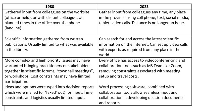 Looking back, I find it quite remarkable to compare my experience, specifically in British Columbia, Canada, with collaborative problem-solving methods before the advent of the internet, to the present-day approach utilized in my area of expertise. There have been notable advancements that have resulted in improved efficiency and facilitated greater access to shared knowledge and collective intelligence. Here are some instances of such changes.