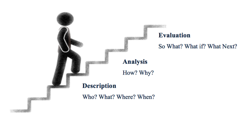 As shown in the diagram, description and simple analysis must precede evaluation, which is where critical analysis lies. With your evaluative skills you must be able to ask yourself what all the description and analysis actually means, what it says about the author or topic and what its implications are.