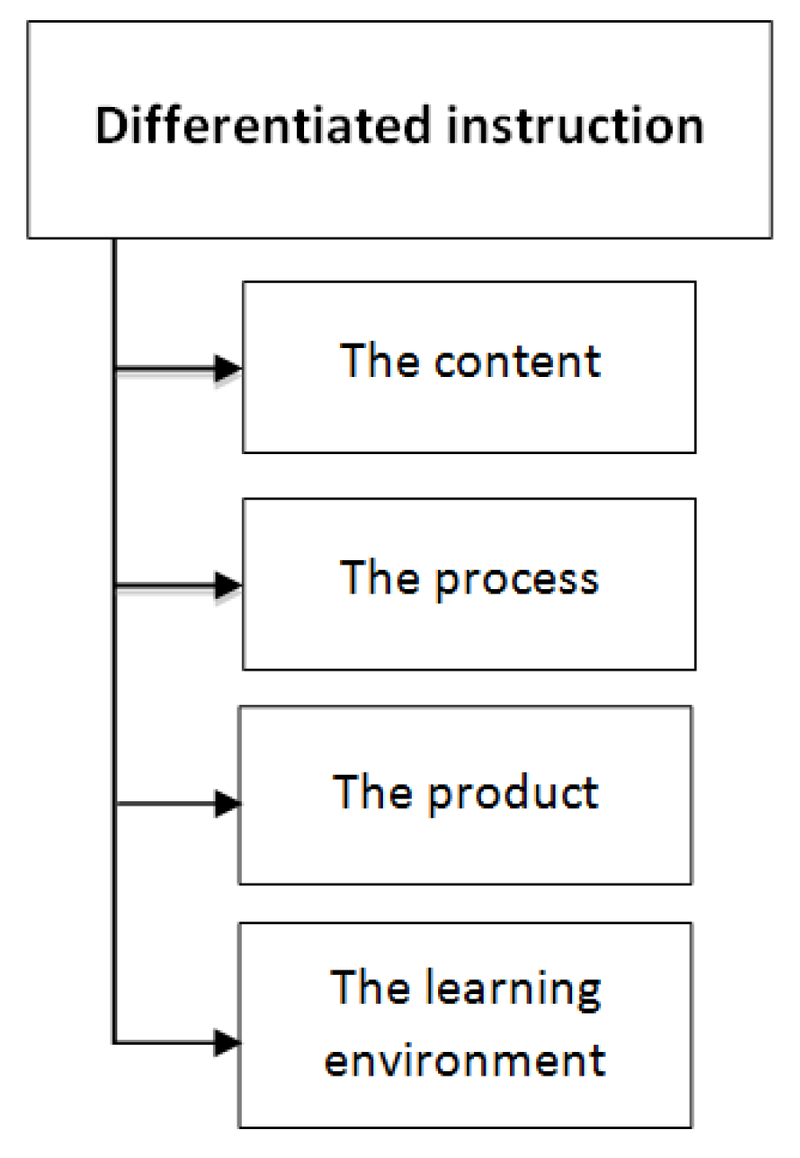 Learners are more productive and motivated if they have the means that meet their needs. Differentiated instruction ensures the implementation of pedagogical techniques adapted to each learner in order to provide pedagogical responses to a given learning situation. However, it does not seek to modify the content to be taught but to change the way, in which it is taught; that is, the learners’ success does not depend on the content itself but on the ability to know when and how to help them apply their knowledge. (Tahiri, J.S., et al, 2017) So without modifying the content, educators are advised to differentiated the following 4 components within the instruction: