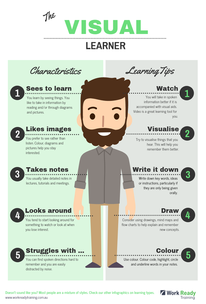 Visual learners are very observant: Visual learners are often very observant and they pay close attention to details, including body language and facial expressions.