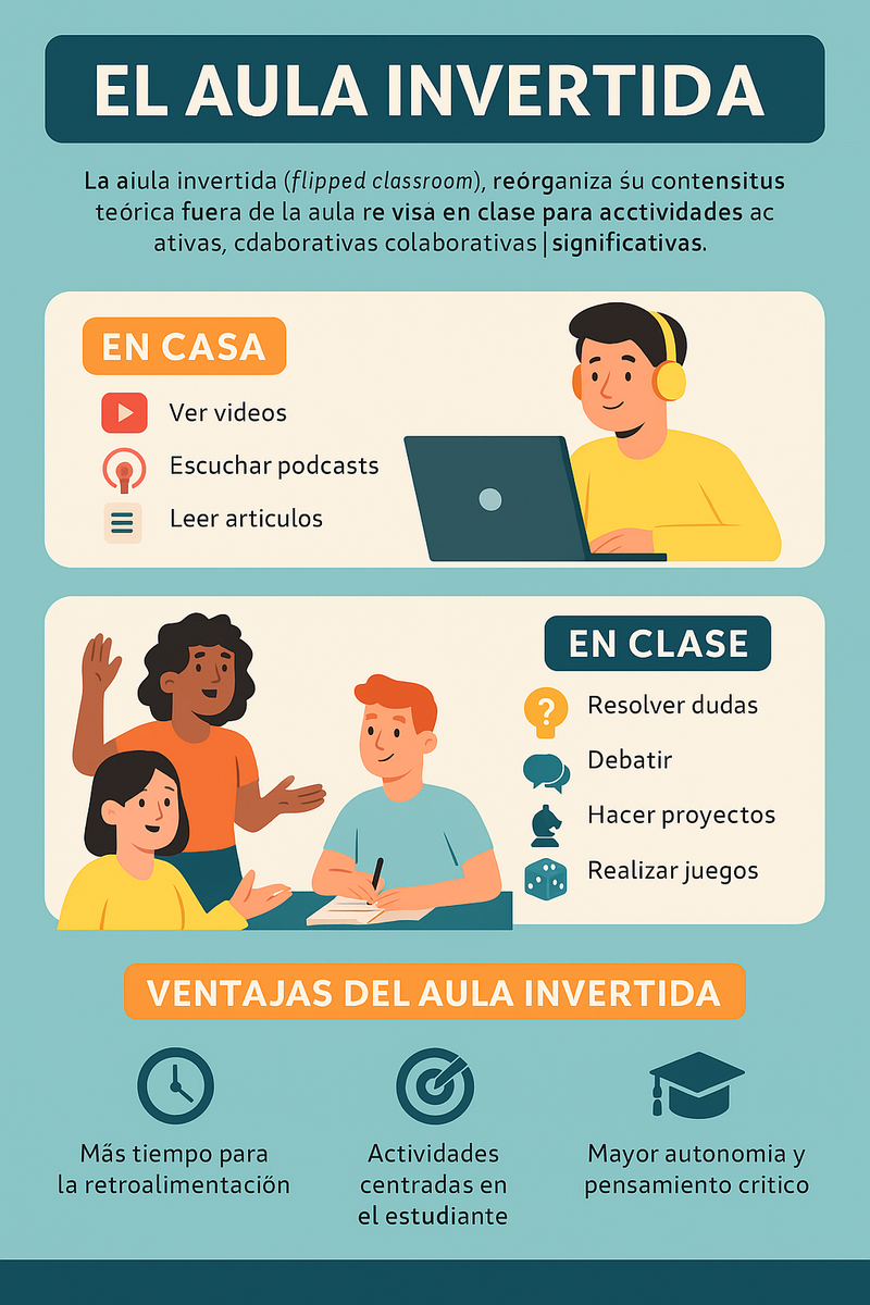 El aula invertida, también conocida como flipped classroom, es una metodología que reorganiza el tiempo de aprendizaje, trasladando la instrucción directa fuera del aula y reservando el espacio presencial para la aplicación de los conocimientos adquiridos a través de actividades más activas, colaborativas y significativas.