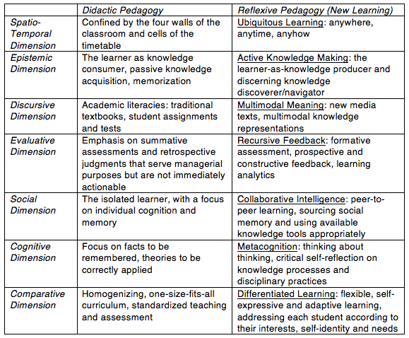 Or framing our case another way, here are the differences between didactic pedagogy and a new learning that we call 'reflexive pedagogy'.