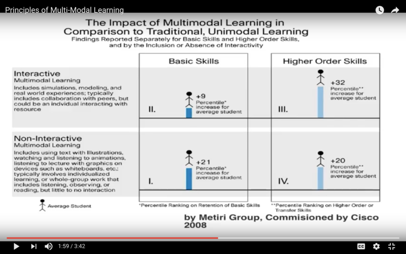 In the “Principles of Multi-Modal Learning” video (https://www.youtube.com/watch?v=b17YT-m2DGk) by Visual Musical Minds, they describe multimodal learning as “the belief that when multiple learning modes are effectively used together, the learner will gain a better understanding of the concept.”