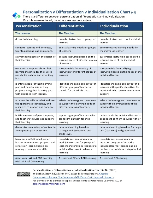 First of all, let's define what is personalized learning. This term must be distinguished from differentiated learning because within the personalized learning model the "what", "when" and "how" to learn depend on the student herself/himself and not on the teacher or institution. The phrase often used to describe personalized learning - "any time, any place or any place" - does not necessarily mean an unlimited choice because the learners have goals to achieve. However, students may choose to learn in the way they prefer following their learning styles and attitudes. Moreover, sometimes personalized learning is improperly used as a synonym of individualized learning, but the two terms have two distinct pedagogical implications. Individualized learning refers to the teaching strategies that aim to ensure same learning objectives for every students, but at different times and modes depending on the learners' cognitive styles; the teacher (or computer) manages and chooses the best solution for learners. See the chart below for a clear explanation among these three models.