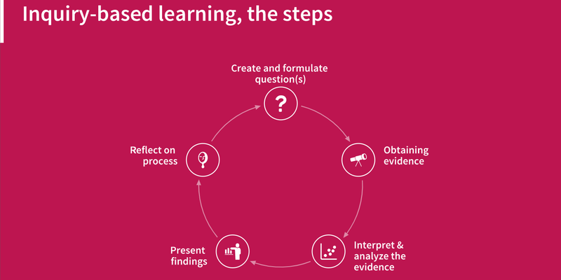 Inquiry-based learning is a pedagogical method. Rather than providing students with established facts –knowledge- , it is method that requires active engagement from students . Students will need to actively engage in researching issues and questioning situations in order to acquire and develop knowledge. Within inquire-based learning, students can be asked to create questions, obtain evidence –do research and collect data-, interpret and analyze the evidence, generalize evidence to other situations, make predictions, present the findings, and finally reflect on this process.