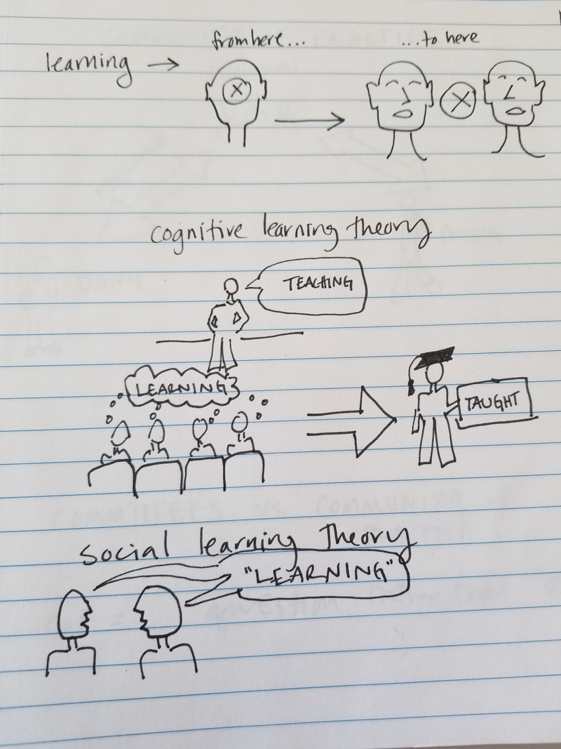 In my own work, I have recently changed roles and organizations, and I found myself thinking about social learning theory and CoPs through the lens of my past and current work and organizations. In my previous role, I was a manager and team-lead responsible for helping a team to develop competencies in a pretty complex environment. A lot of my philosophy as a manager was to make space for people to share expertise and problems, rather than to myself deliver “trainings” using a top-down approach. Without realizing it, I was working to develop a community of practice among my team and our counterparts believing that the most effective learning for my organization was learning that happened peer to peer in a social and informal environment. The resultant groups were, I think, true Communities of Practice, checking each of Wenger's three boxes.