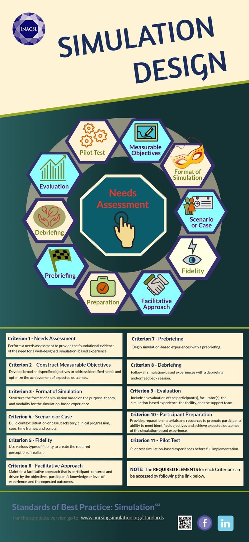 Another helpful resource for designing simulations is the International Nursing Assocation for Clinical Simulation and Learning’s (NACSL) standards of best practice for designing simulations. The full document can be found here: https://www.nursingsimulation.org/article/S1876-1399%2816%2930126-8/fulltext