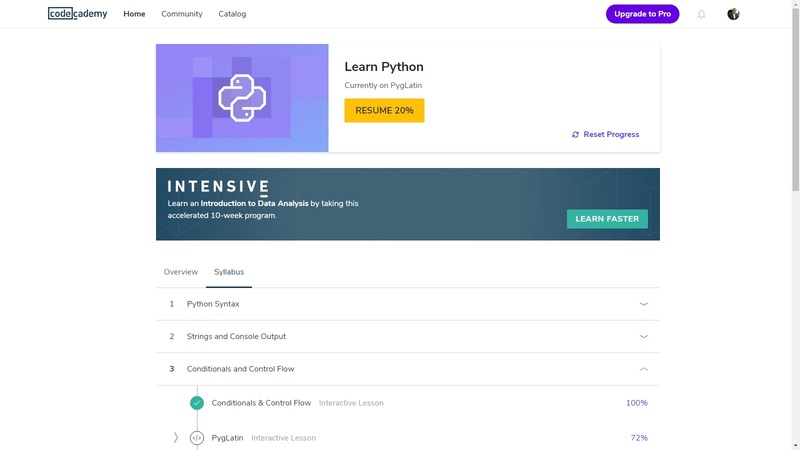 Since Summer of 2018, I and my 12-year old daughter have separately signed up, via our individual accounts, for Code Academy to learn the Python programming language. Due to her routine school work, which is quite intensive, she is only able to develop her coding skills on Saturdays. Sometimes, if she gets excited about a concept, like recursive loops, she spends the entire weekend to master that module; otherwise, it is only 3-4 hours of effort per week that she is able to spend on learning this important skill. She has already upgraded herself from the free / beginner version to the pro/paid version because she was finding the free version not too challenging, after a month of learning Python through this amazingly interactive platform. Towards the end, probably around Summer of 2019, she plans to upgrade to the Intensive/10-week accelerated version to take her skills to the next level. My vision for her is that she is able to become a good/professional category programmer by the time she finishes up High School, since I believe computer programming and computational problem solving skills are as fundamental as learning English language and/or Mathematics, to compete and thrive in the new globalized environment driven by the 4th Industrial Revolution. However, her school administration does not subscribe to this fundamental assertion, at least not to the level I do; hence, the need for this Code Academy solution.